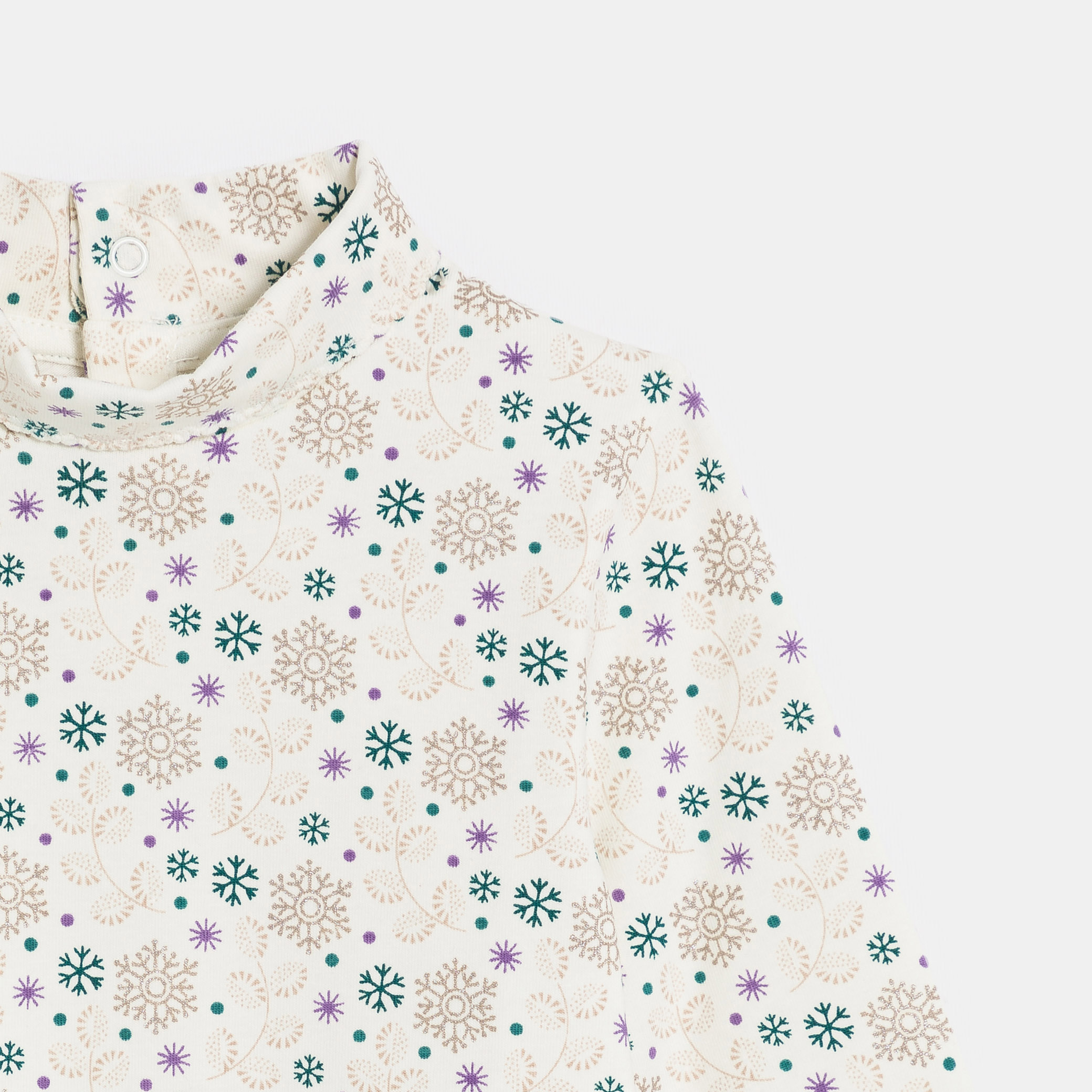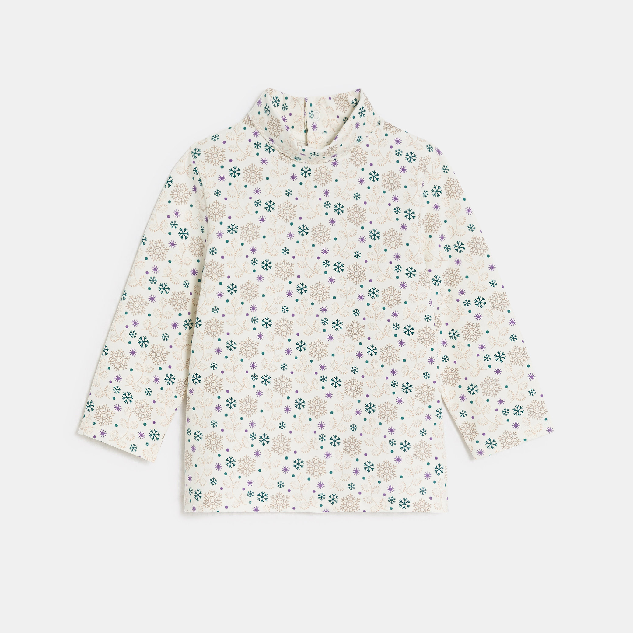 Зимна щампа върху тениска с висока яка и дълги ръкави. Прав подгъв и закопчаване на гърба за лесно обличане на момичетата.