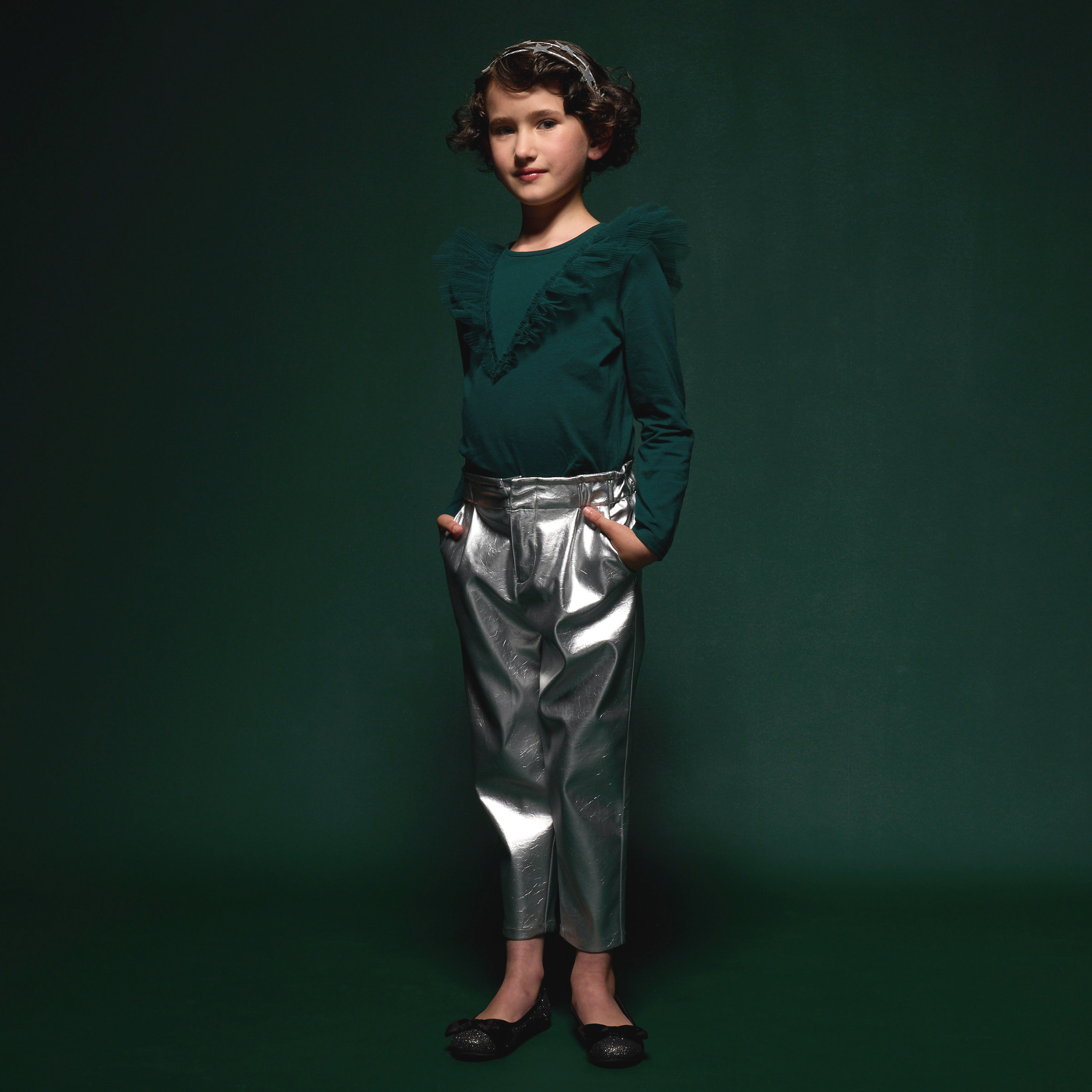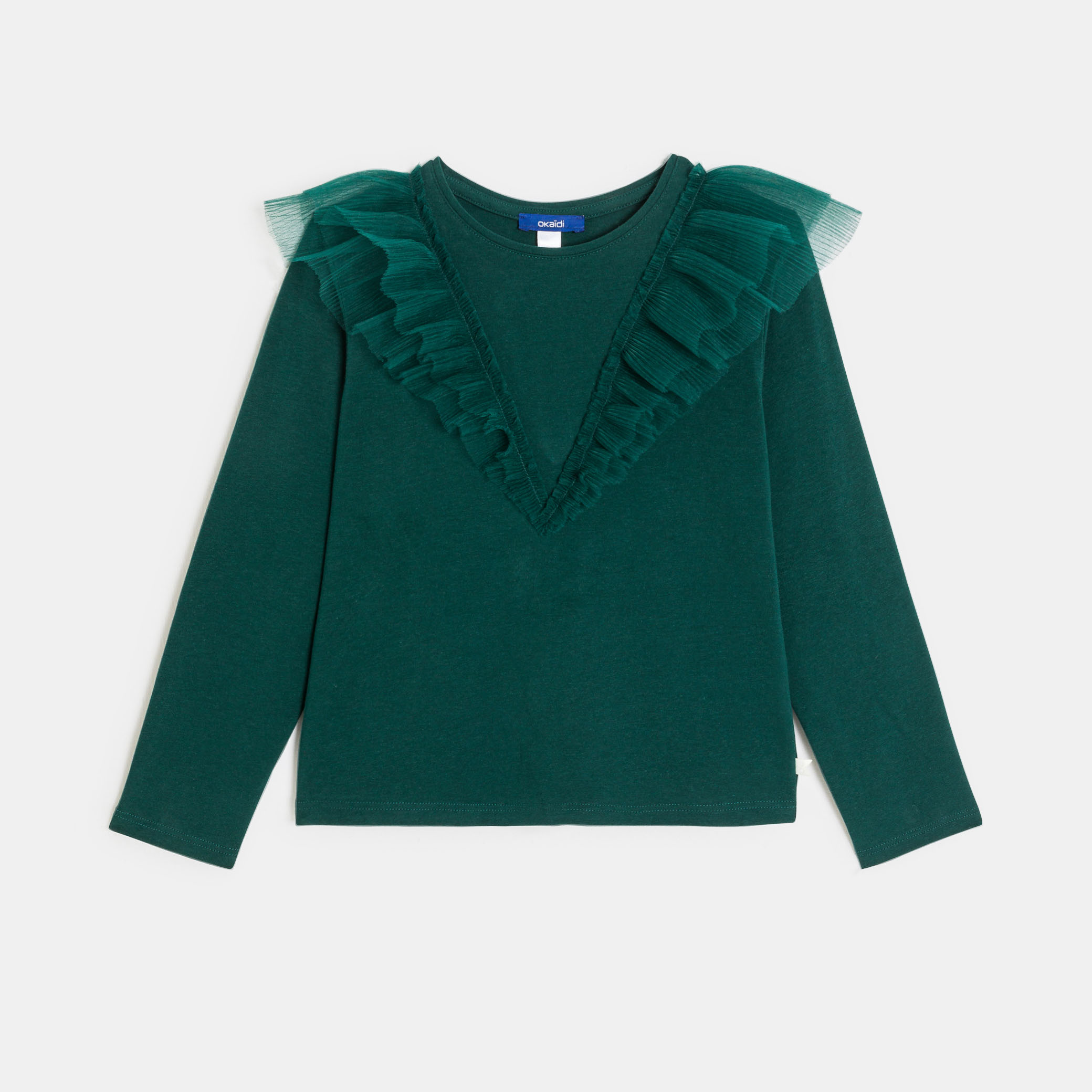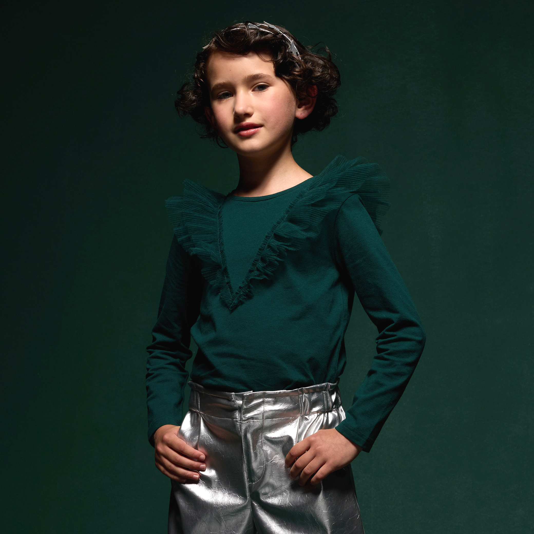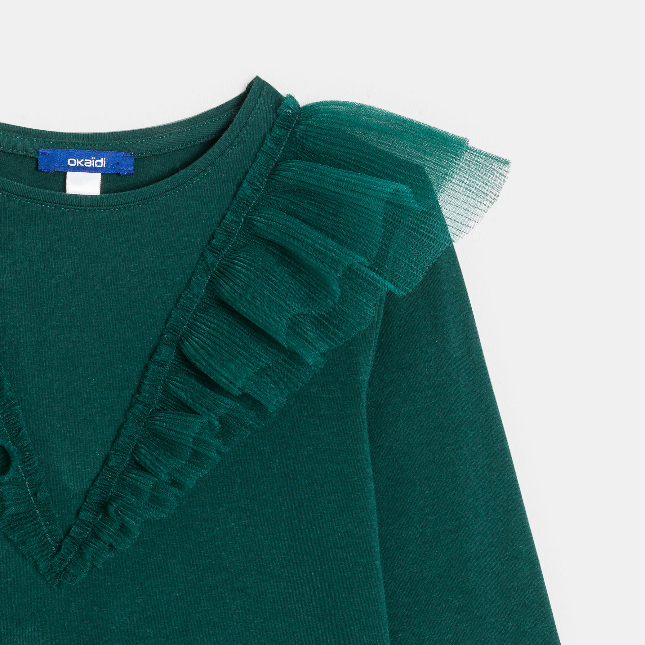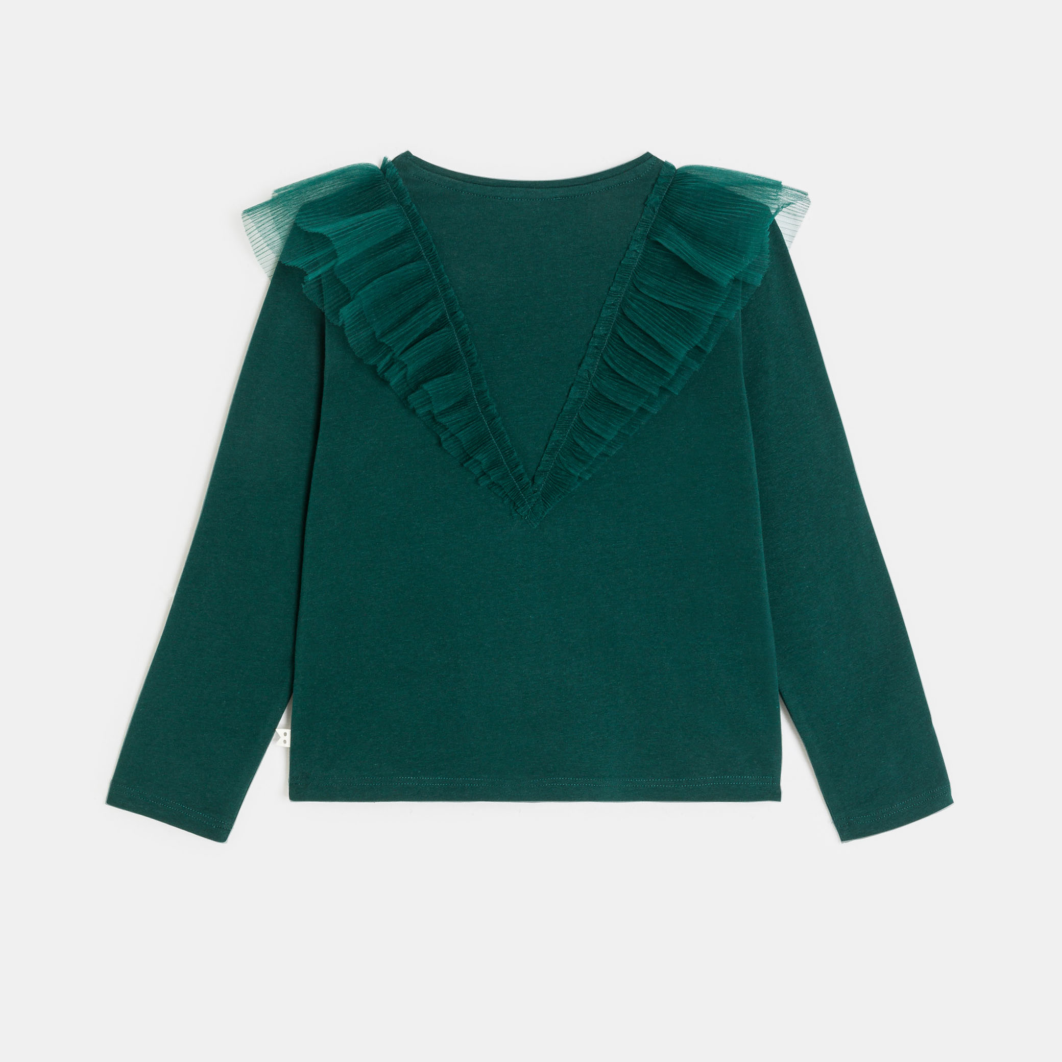 Тази зелена тениска има очарователен волан от тюл, който придава изтънчен и елегантен вид. Свободната кройка и дългите ръкави я правят идеална за ежедневно носене, съчетавайки комфорт и стил. Изработена от меко трико, тя предлага оптимална свобода на движенията за активните дни.Състав