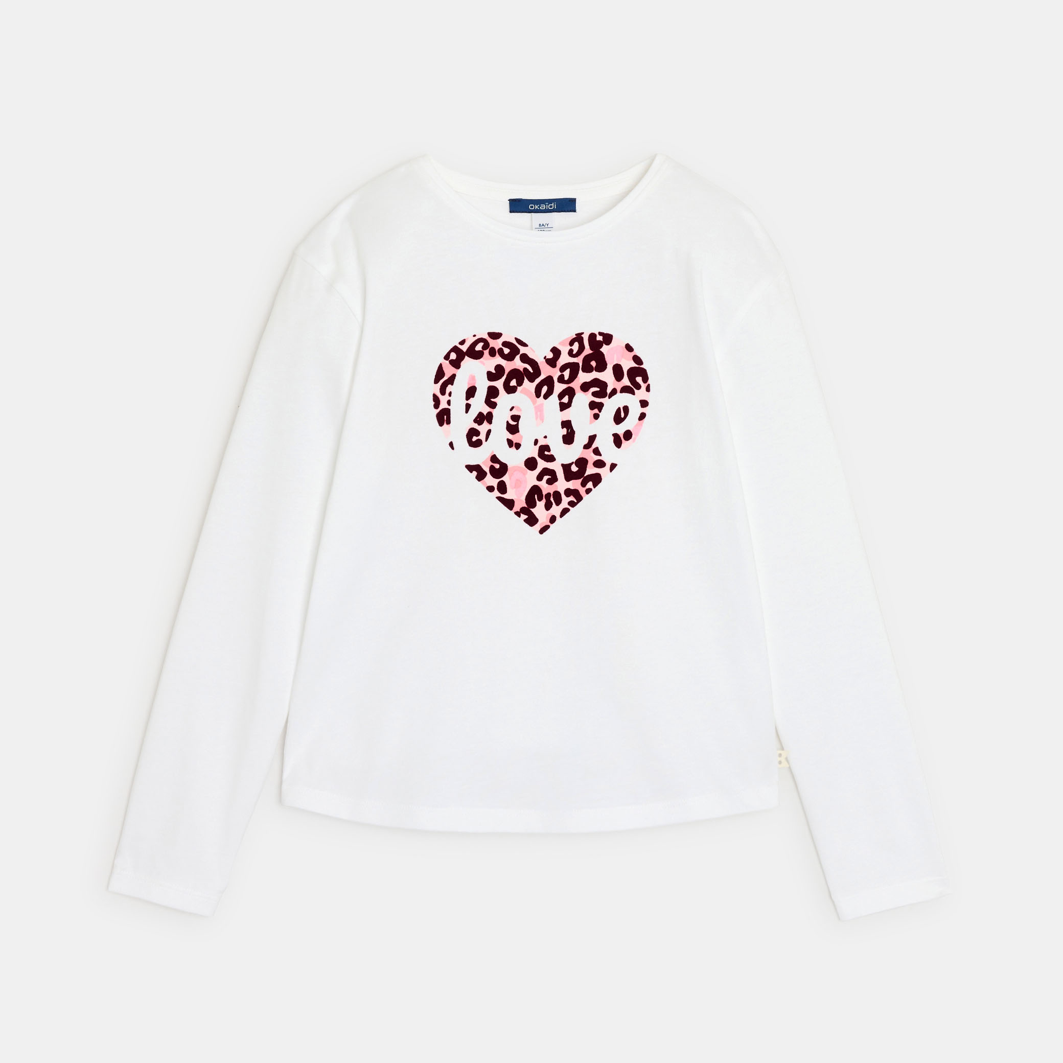 Емблематичният мотив на сезона, съчетан със сърце, изпълнено с любов: момичетата бързо ще се влюбят в тази мека памучна тениска. Дългите ѝ ръкави я правят лесна за носене и е незаменима дреха за всеки сезон.