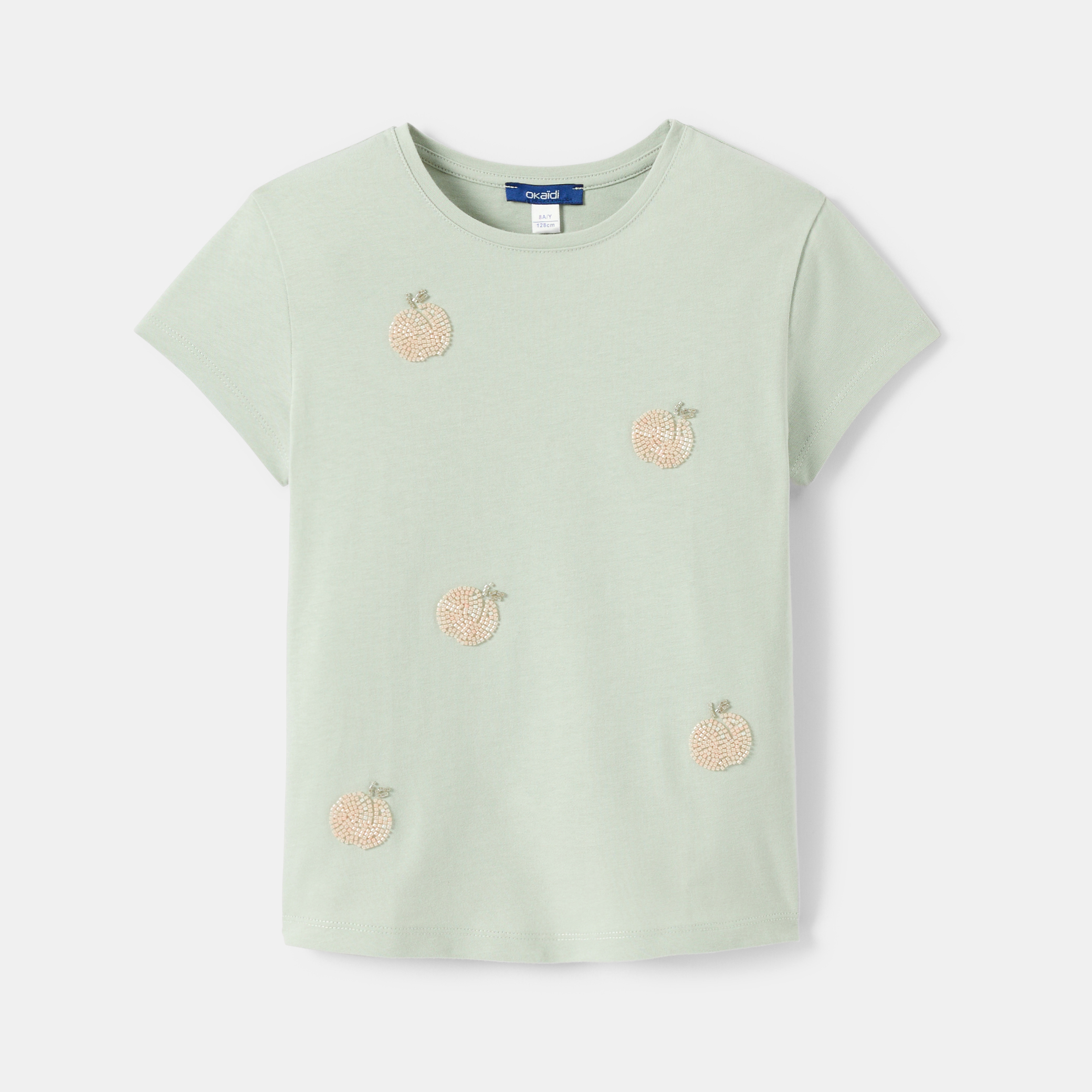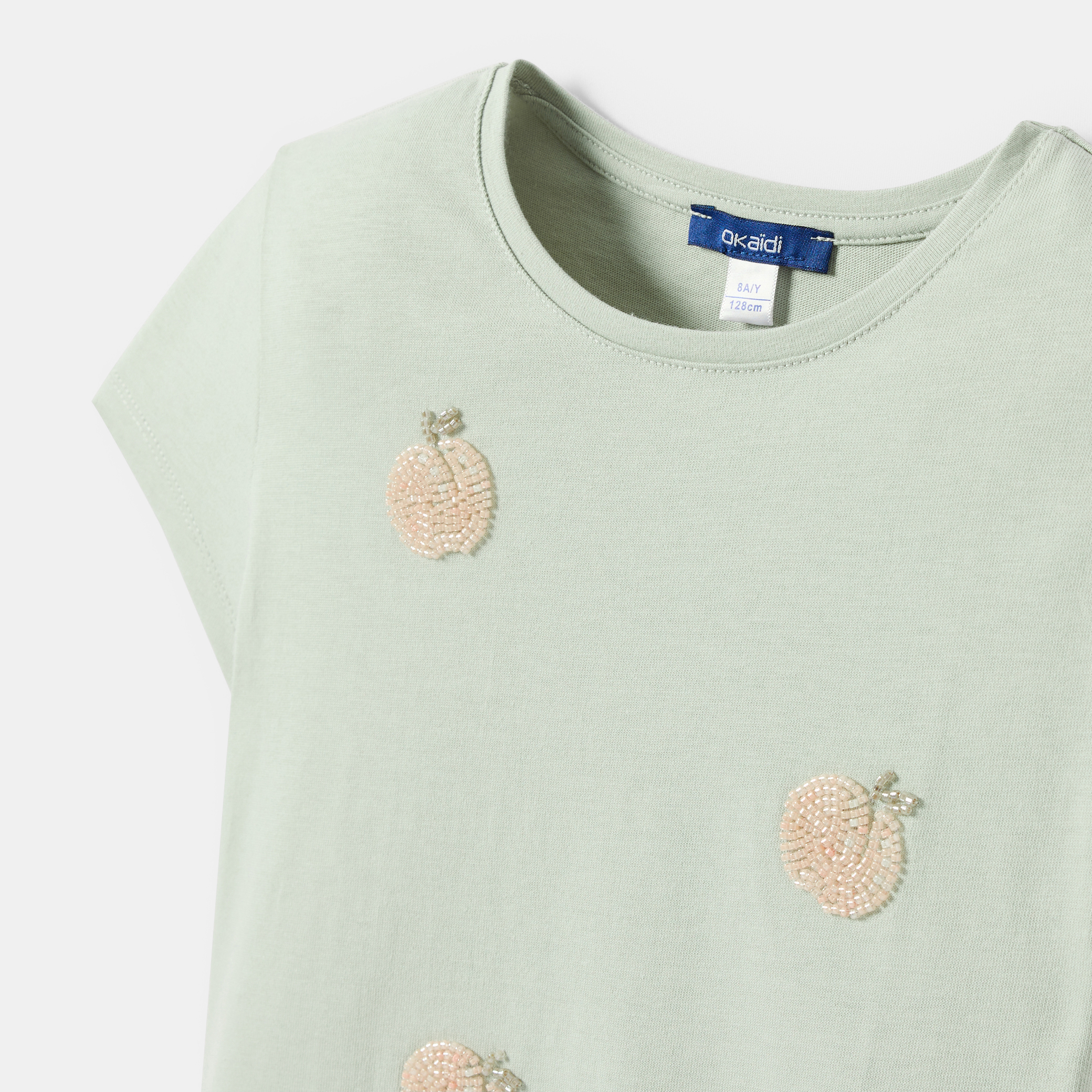 Мека зелена трикотажна тениска, идеална за слънчев ден. Стандартна и удобна кройка, с красиви бродирани прасковени мотиви. Кръглото деколте и късите ръкави предлагат оптимална свобода на движение за ежедневно носене. Лесна за обличане, идеална за стилна игра на открито!
