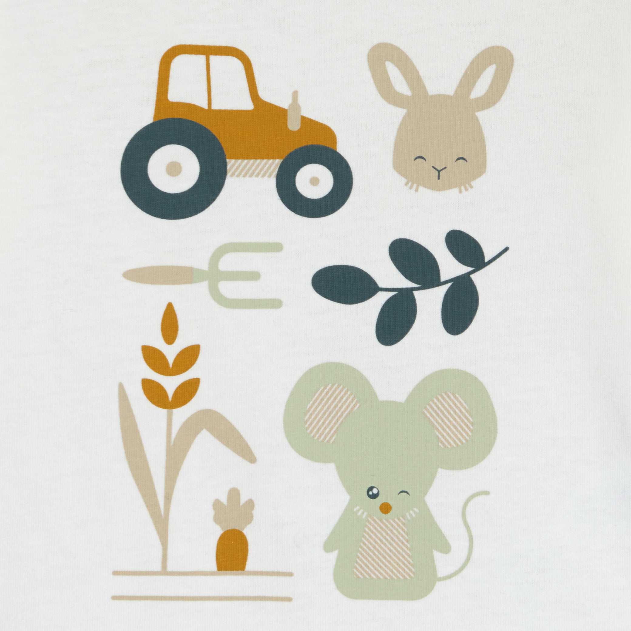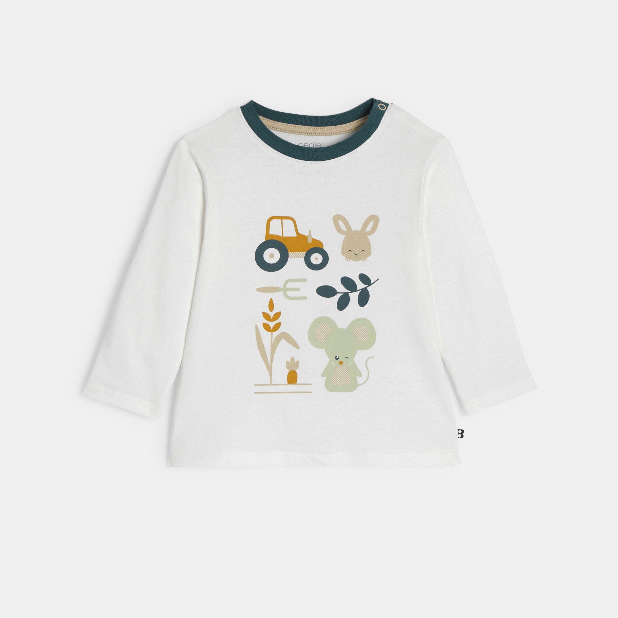 Влюбете се в тази бяла тениска с дълъг ръкав, идеална за ежедневен комфорт. Изработена от мек трикотаж, тя е със забавни дизайни на трактори и животни. Кръглото деколте и копчетата тик-так на рамото я правят лесна за обличане. Идеална за изследване и свободна игра!
