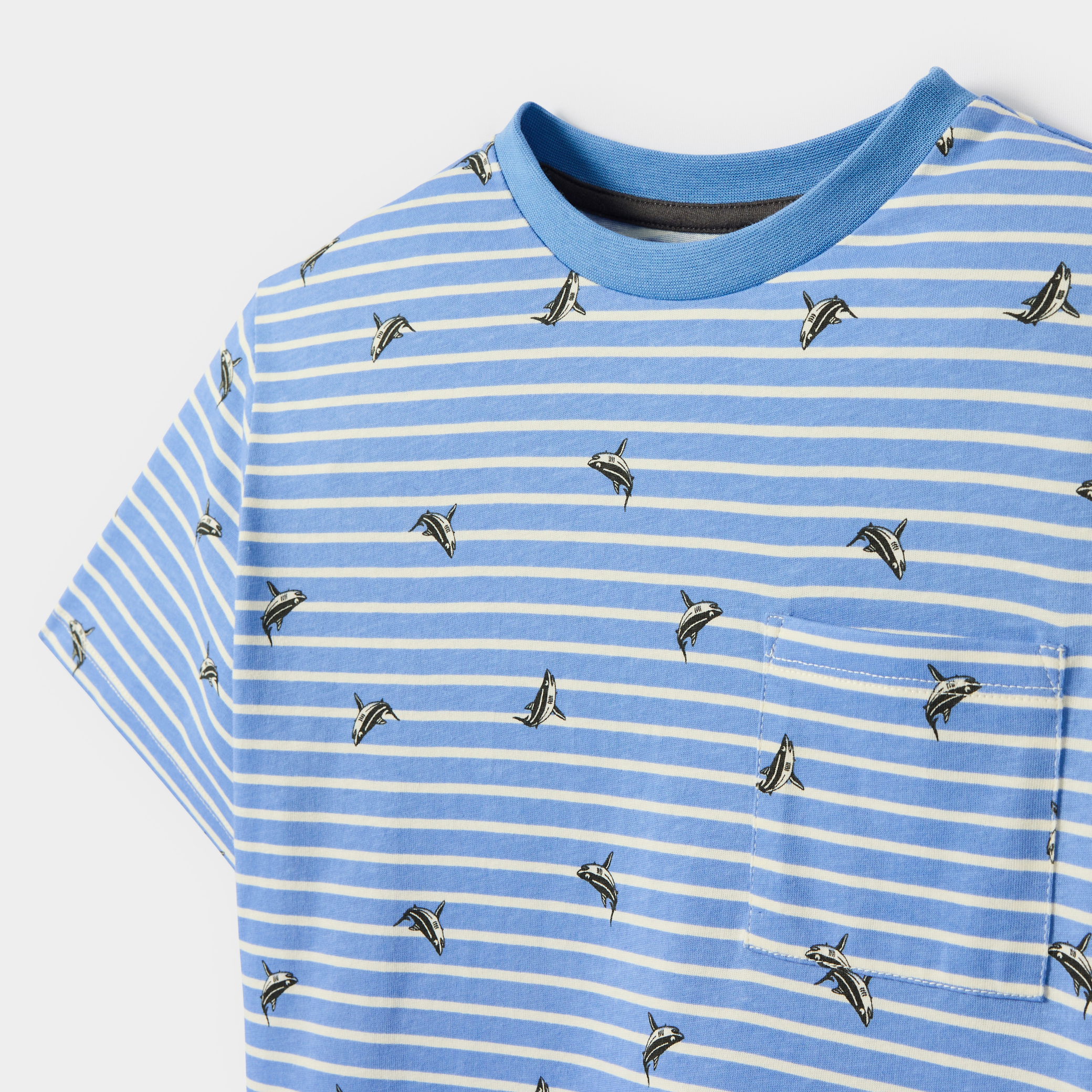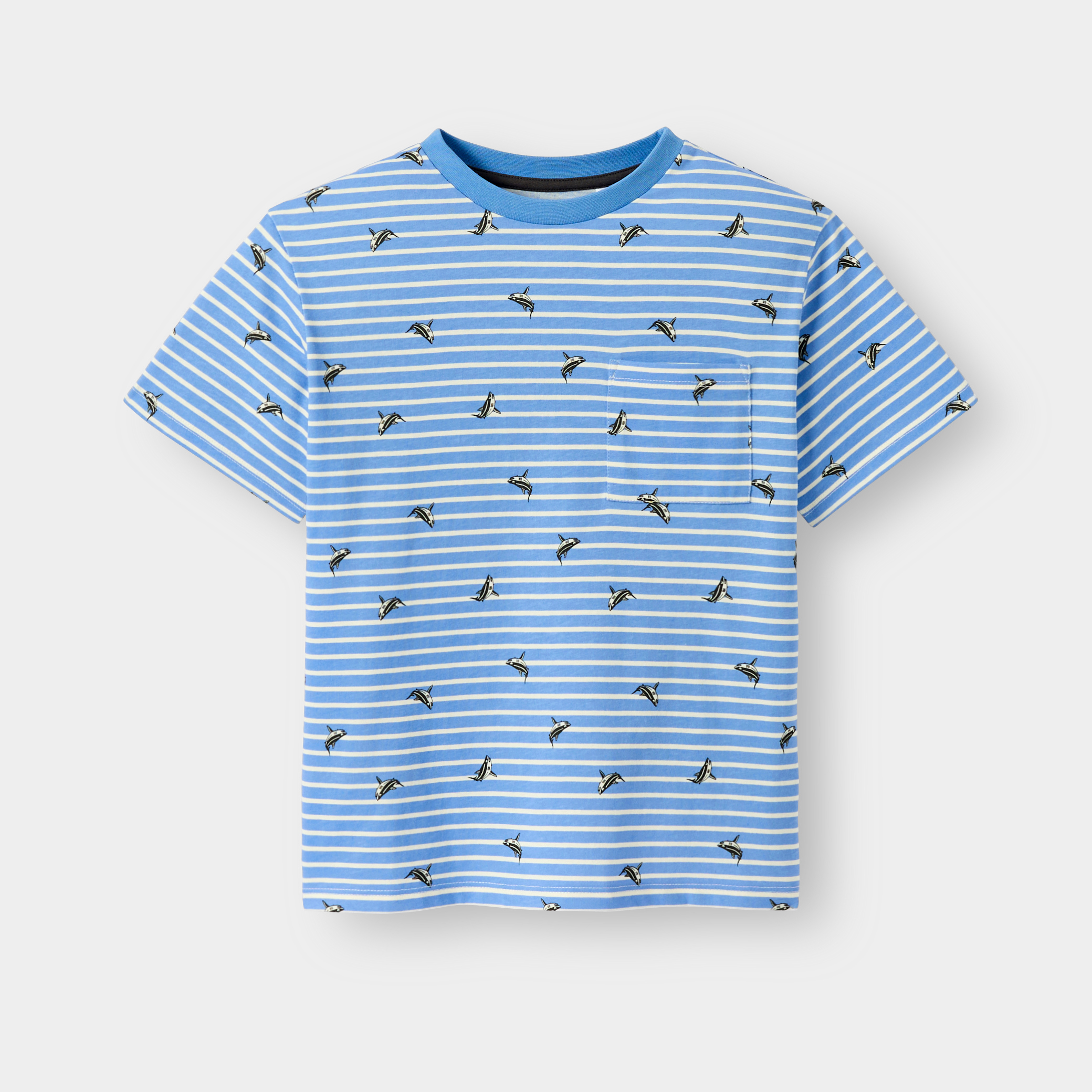 Тази синя раирана тениска за момчета е идеална за ежедневна визия. Изработена от мек трикотаж, тя предлага оптимален комфорт. Принтирана с оригинални дизайни, тя е с класическо кръгло деколте, къси ръкави и практичен джоб на гърдите. Идеална за ежедневно носене, тази тениска съчетава стил и практичност за всички ваши приключения.