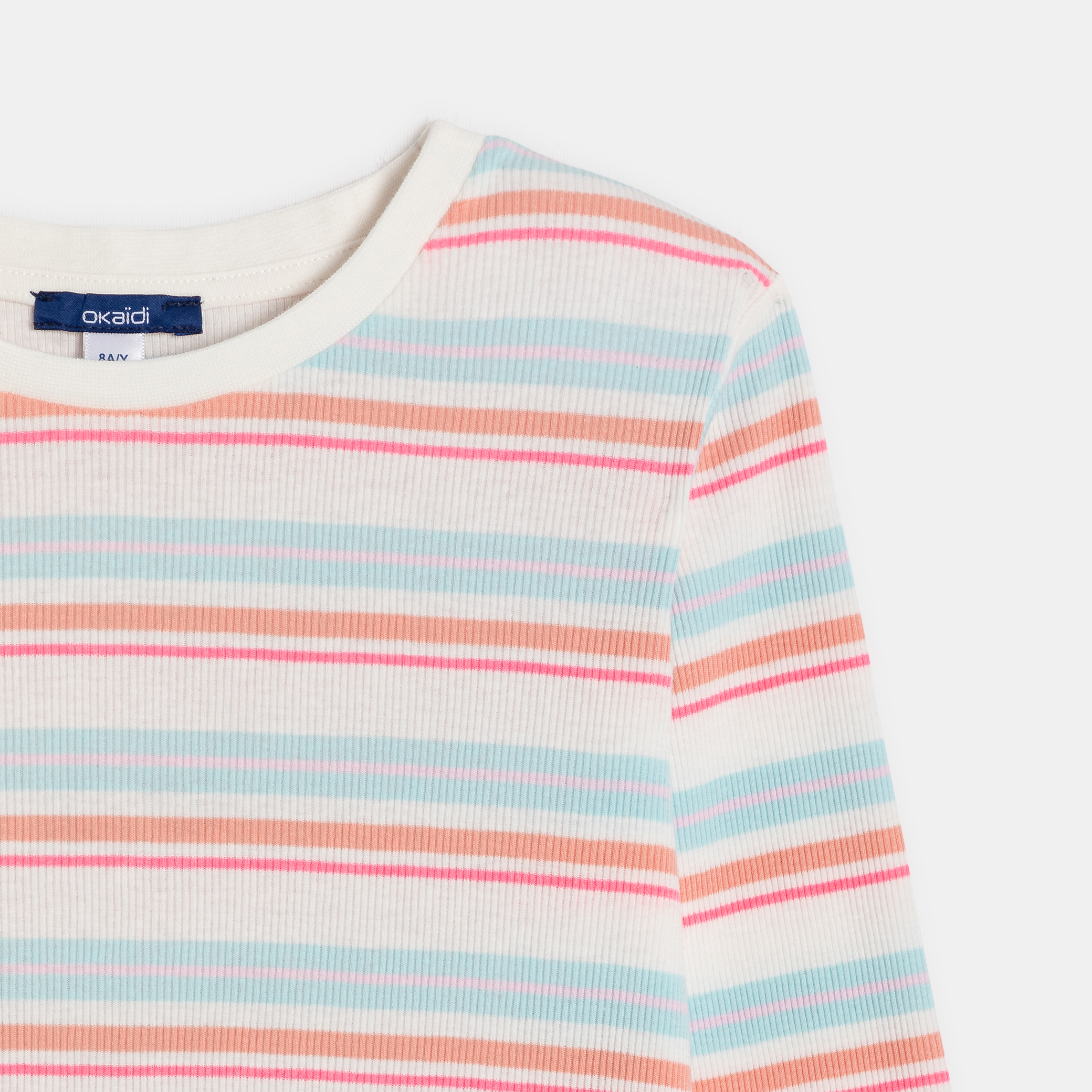 Обичаме мекотата и удобството на тази фино оребрена плетка. Естествено еластична, тя топли момичетата при всеки повод. Раирана тениска с дълъг ръкав, която можете да носите с пола или панталон.