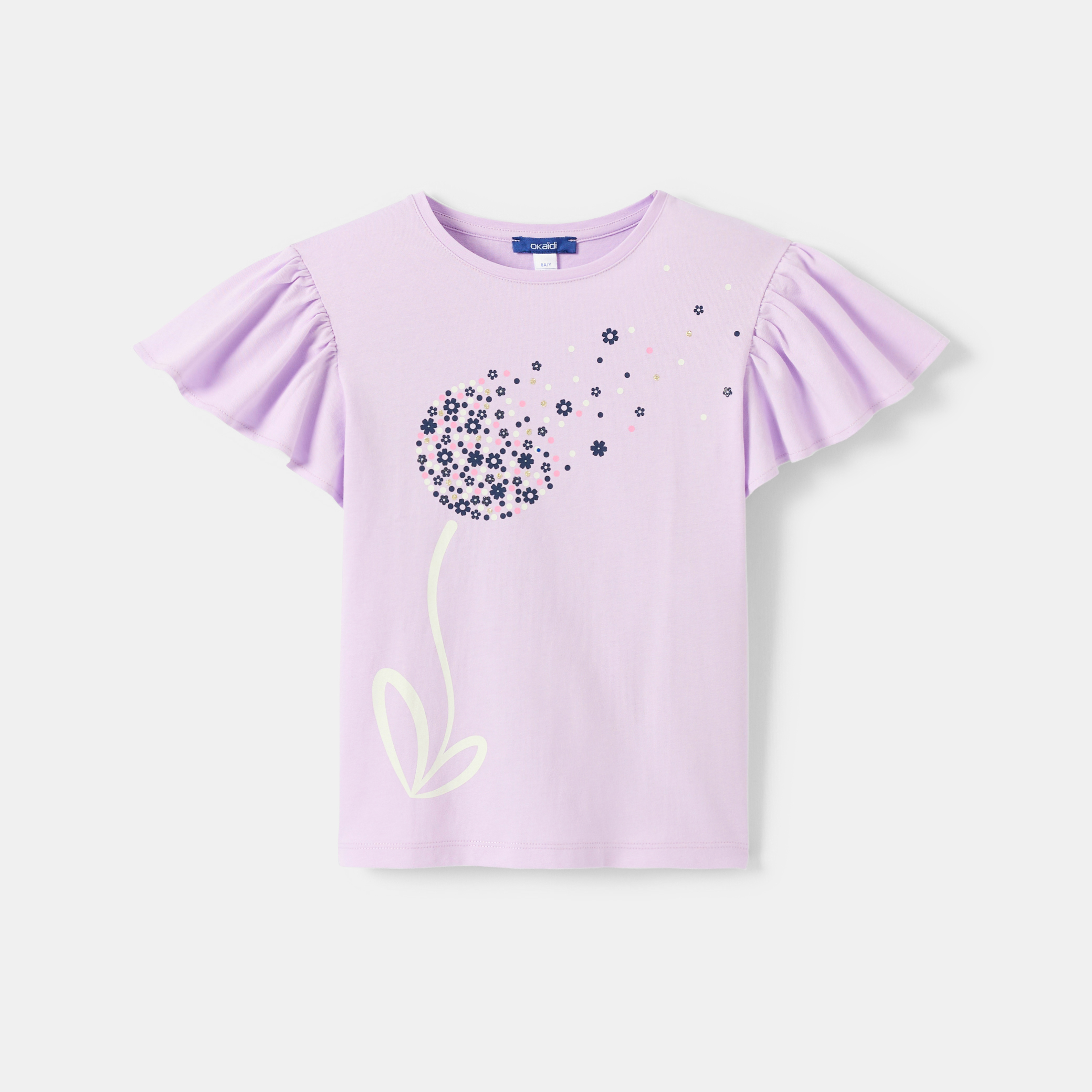 Лилава тениска с волан и флорален принт
