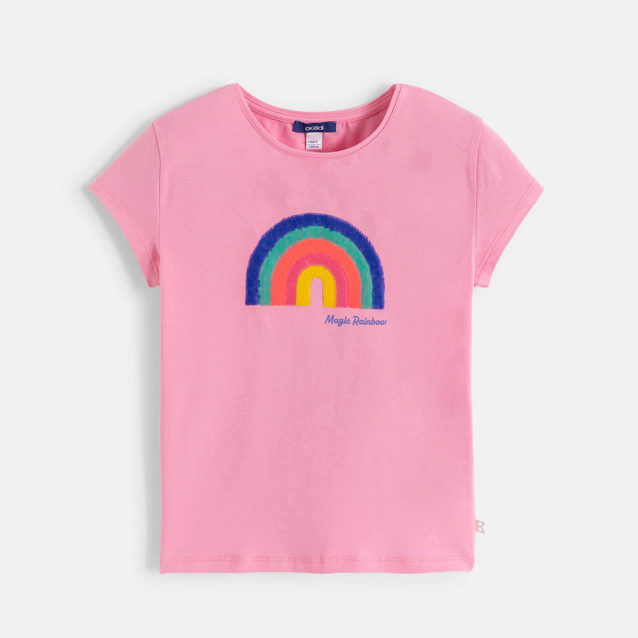 Вълшебната тениска, която всички момичета обичат! Просто прокарайте ръка по дъгата и тя променя цвета си. Изработена от мек памук, тази тениска с къс ръкав, права кройка и кръгло деколте е задължителна част от гардероба на момичетата.Състав