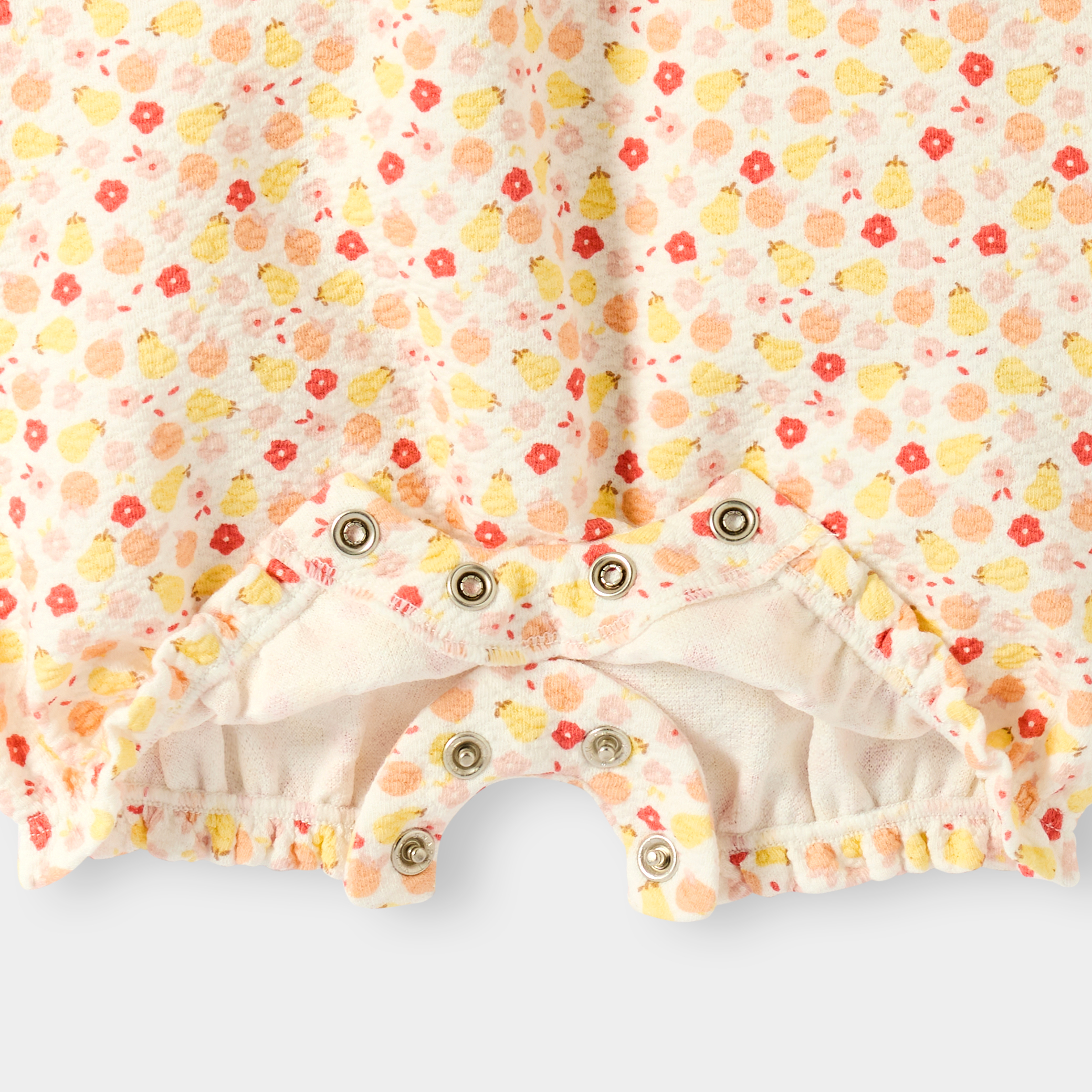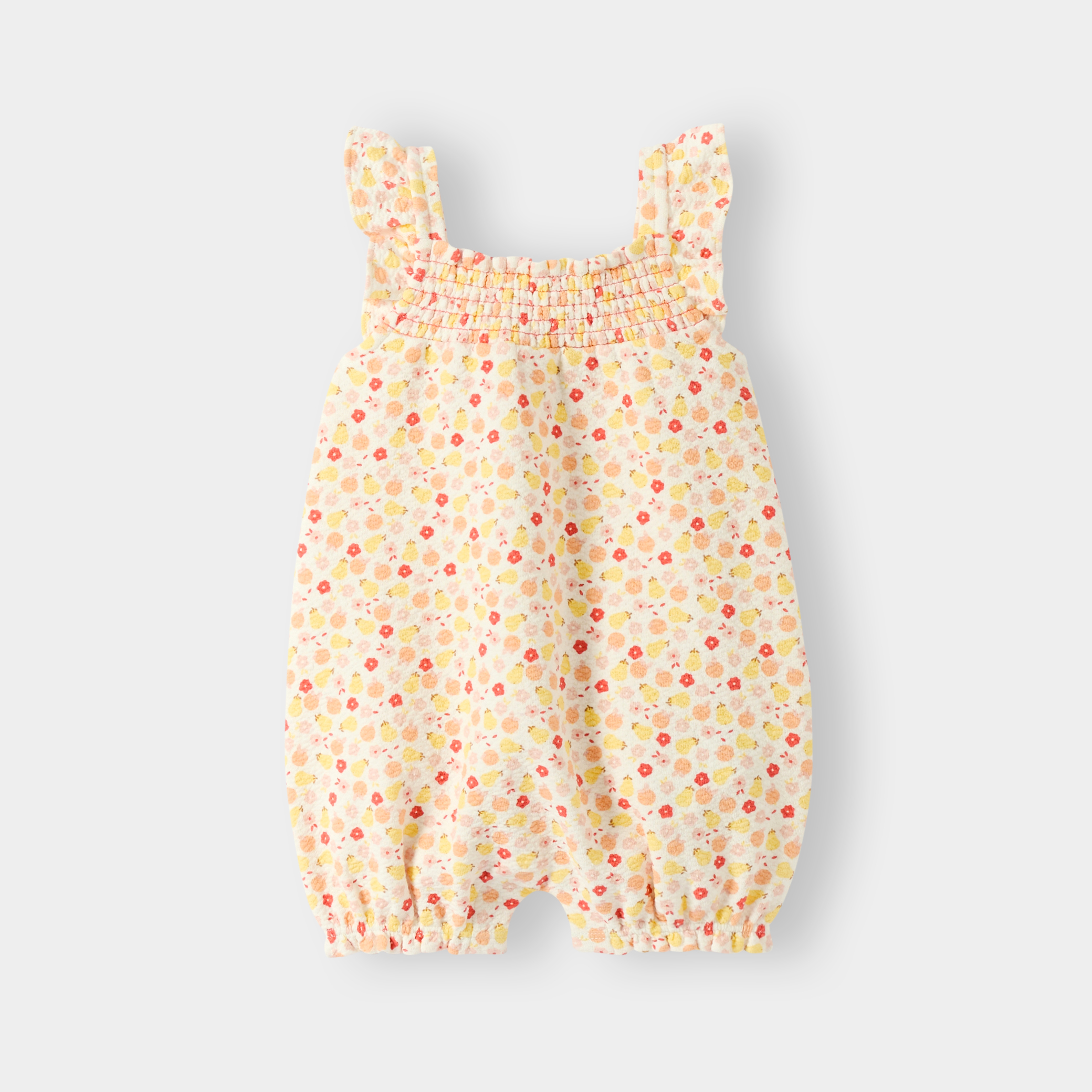Малчуганите ще изглеждат стилно в този лек гащеризон! Изработен от забавен памучен плат с вафлена текстура и щампи с малки цветя и плодове, със свободна, прилепнала кройка за лесно обличане, той гарантира комфорт за момичетата! Характеристиките му включват волани презрамки, еластични отвори за крачолите и закопчавания с тик-так на чатала. Идеален за сладки летни приключения.Състав